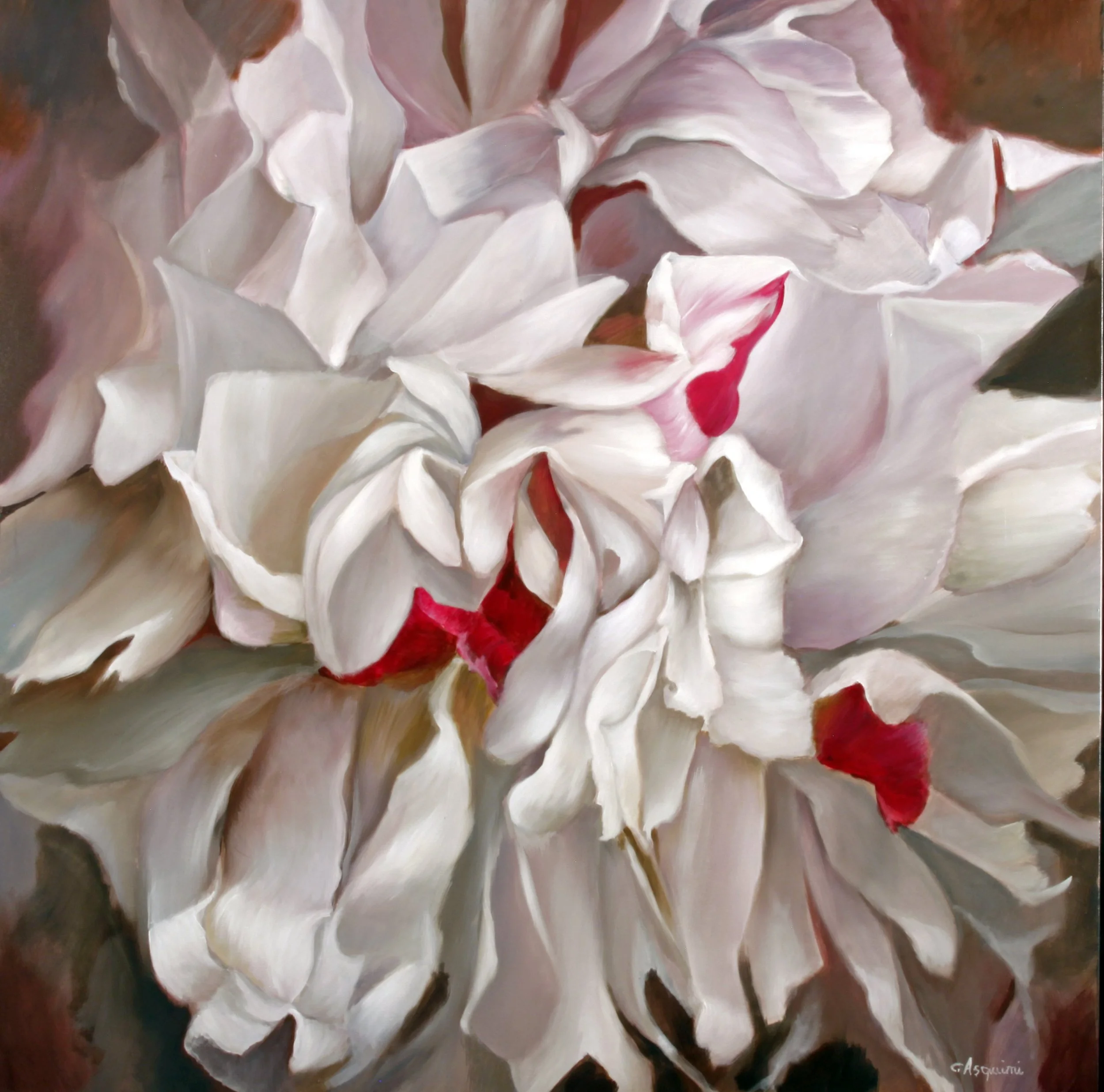Close-up painting of white peonies with yellow and red accents against a dark background.